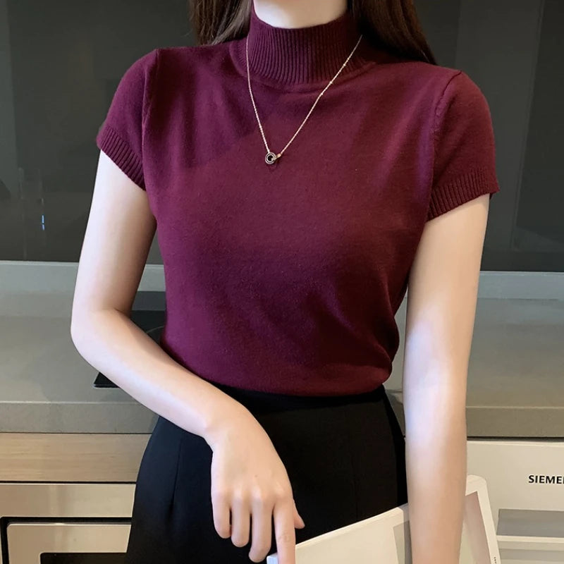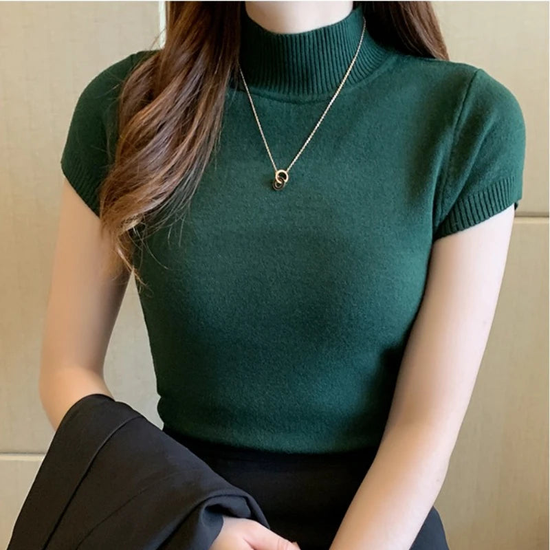 2025 Fashion Woman Pullovers Short Sleeve Autumn Tops Women Turtleneck Knitted Sweater Korean Style Elegant Solid Slim Tops