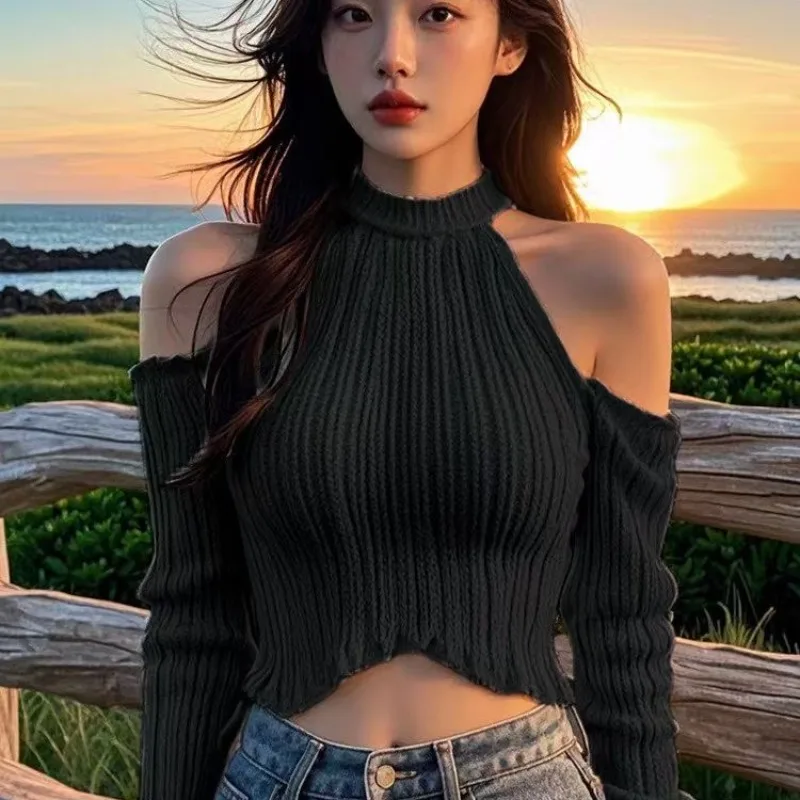 2025 Solid Elegant Off Shoulder Ribbed Crop Tops Autumn Fashion Casual Skinny Long Sleeve Camis Gentle Y2K Tight T-shirts