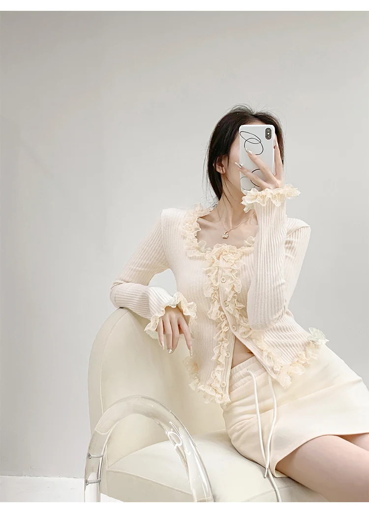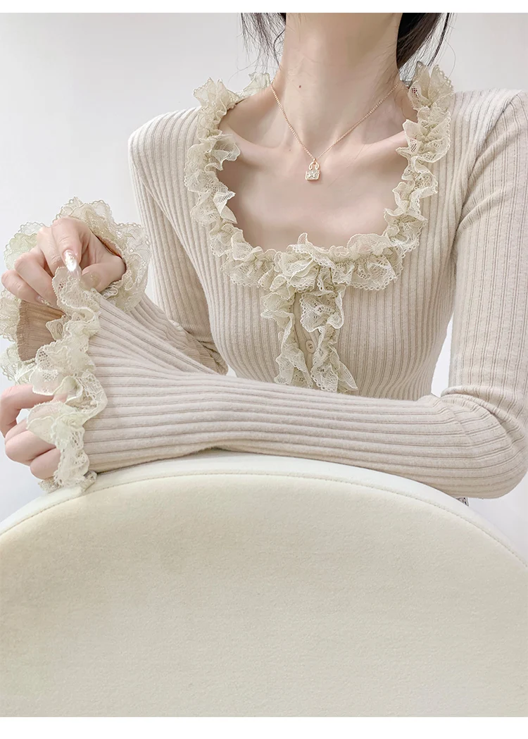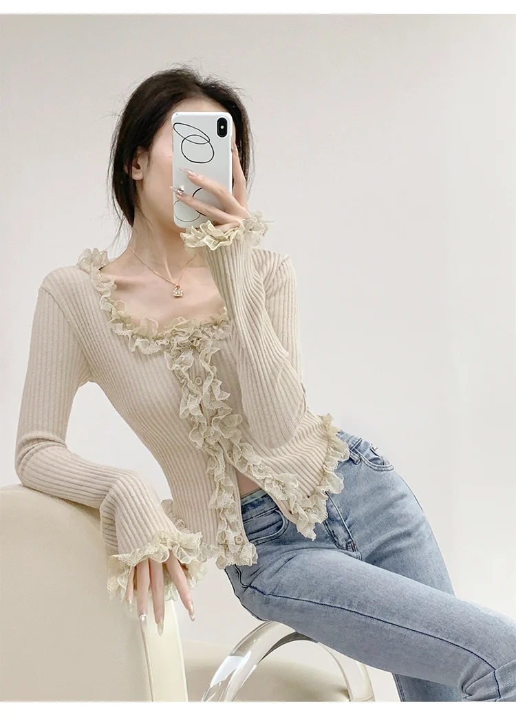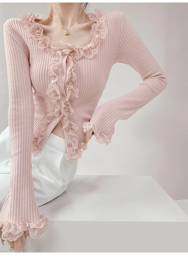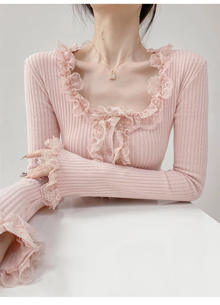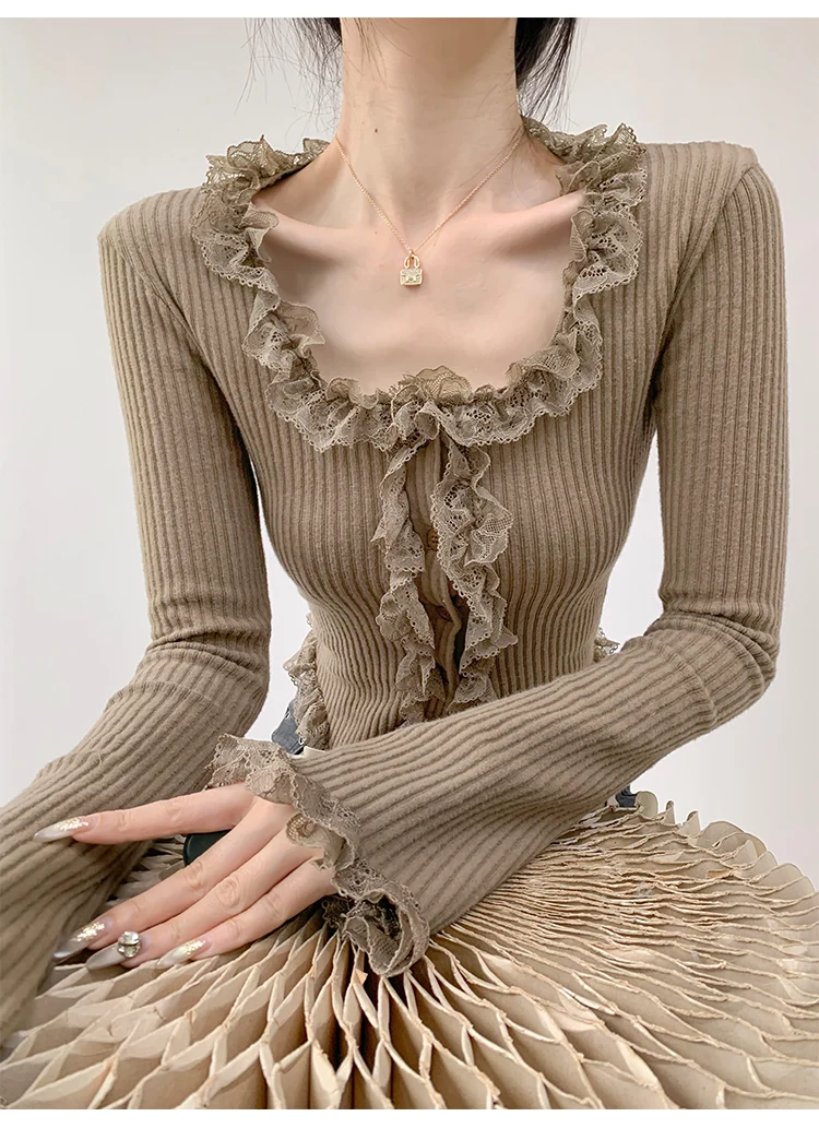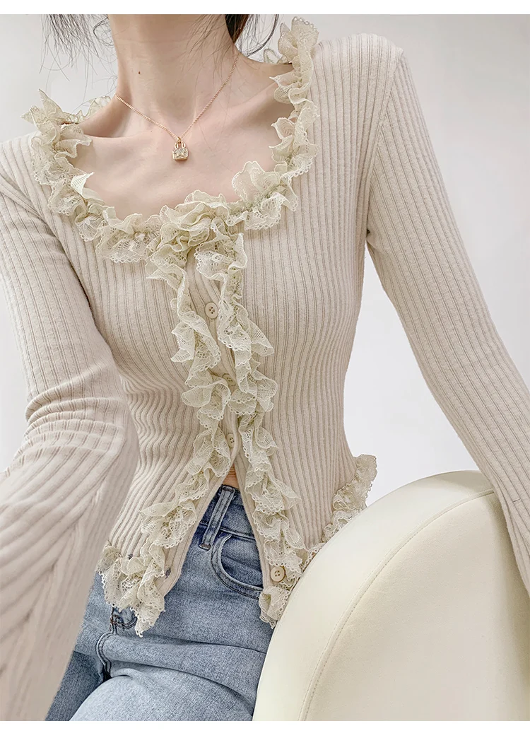 2025 Square Collar Lace Edge Splicing Long Sleeve Knitted Sweater Women's Retro Short Style Slim Tops Single-breasted Cardigan