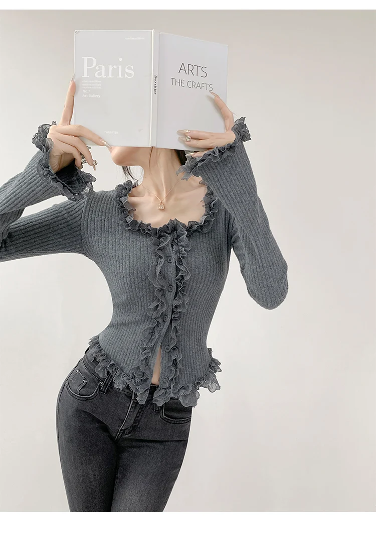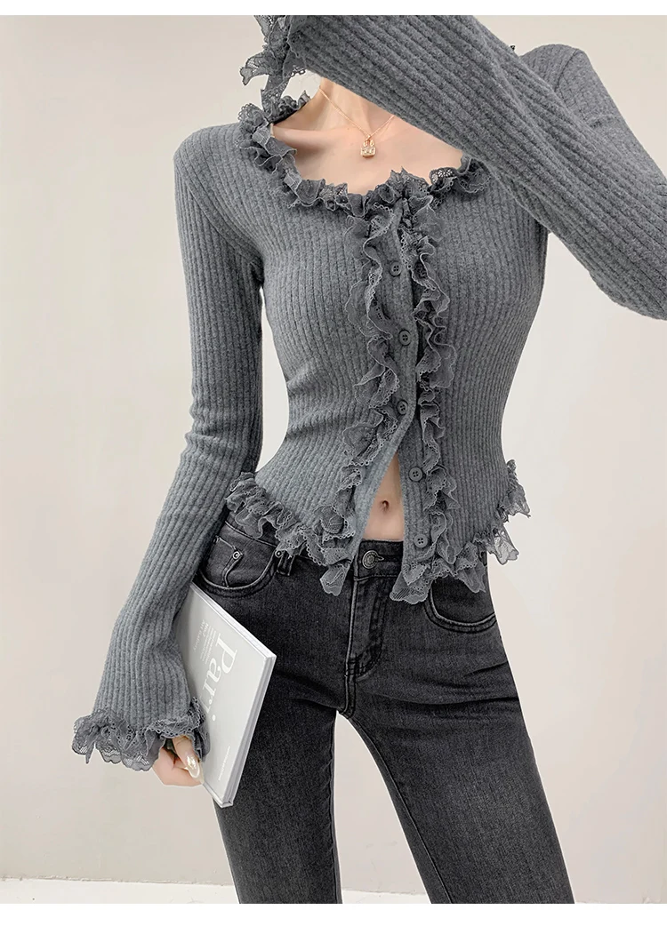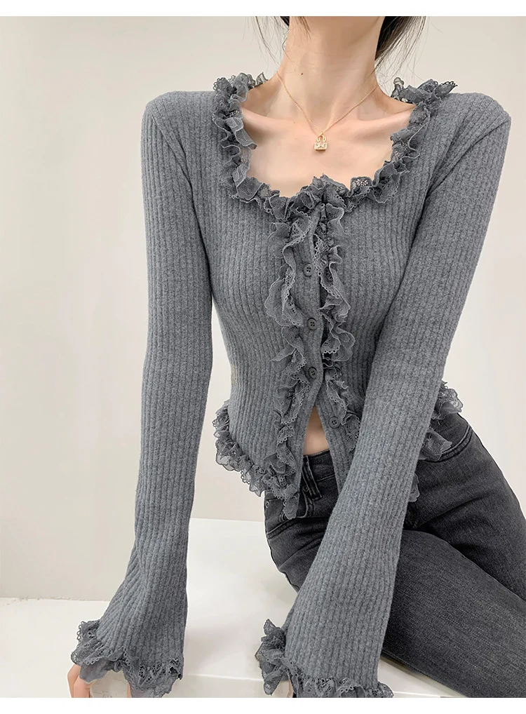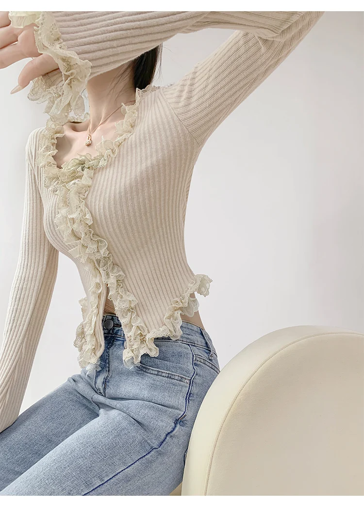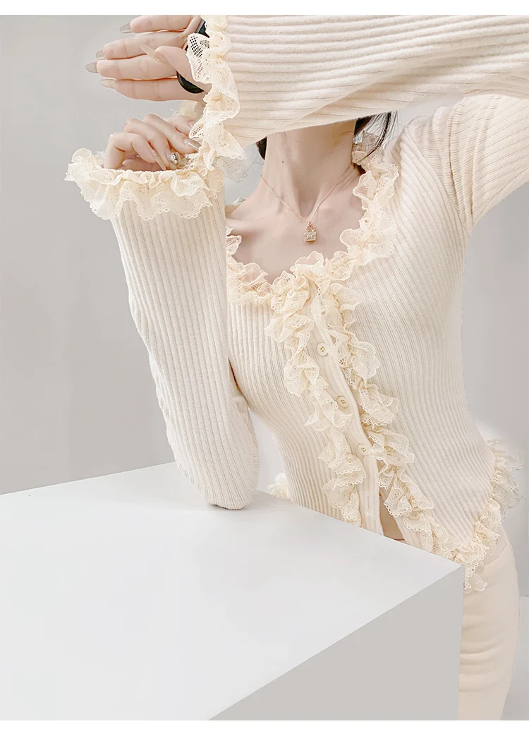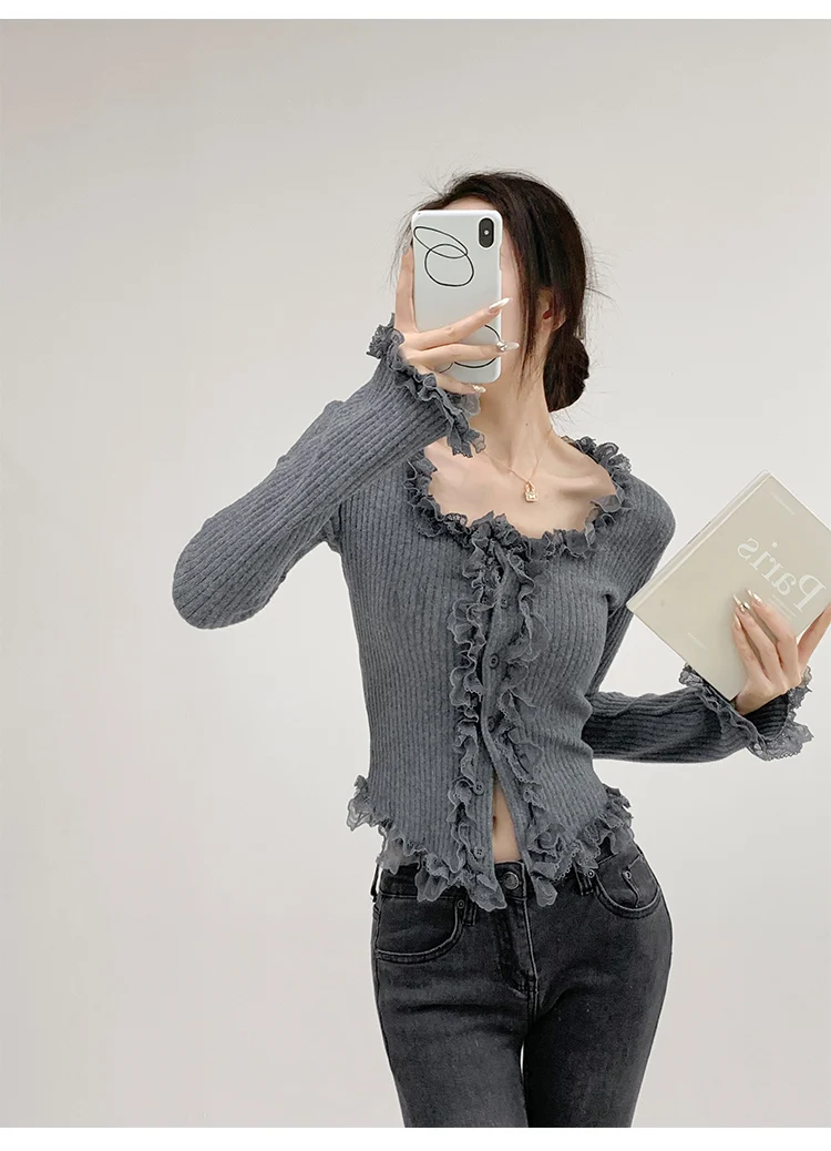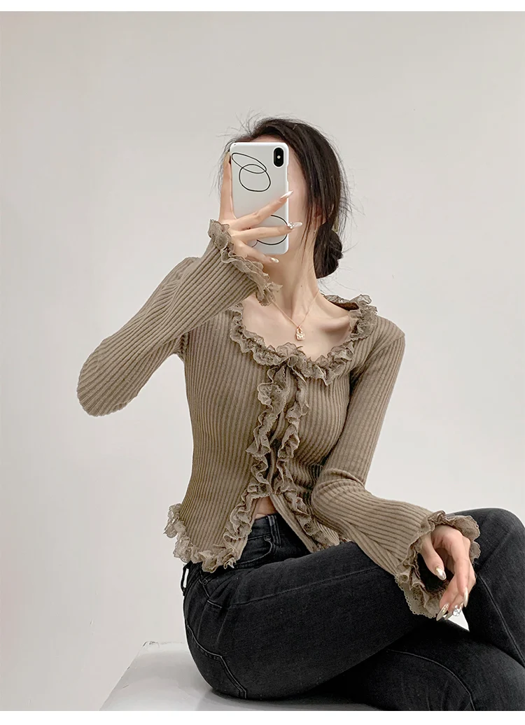 2025 Square Collar Lace Edge Splicing Long Sleeve Knitted Sweater Women's Retro Short Style Slim Tops Single-breasted Cardigan