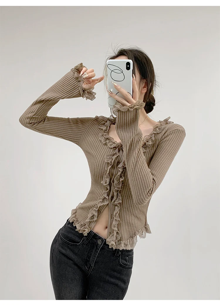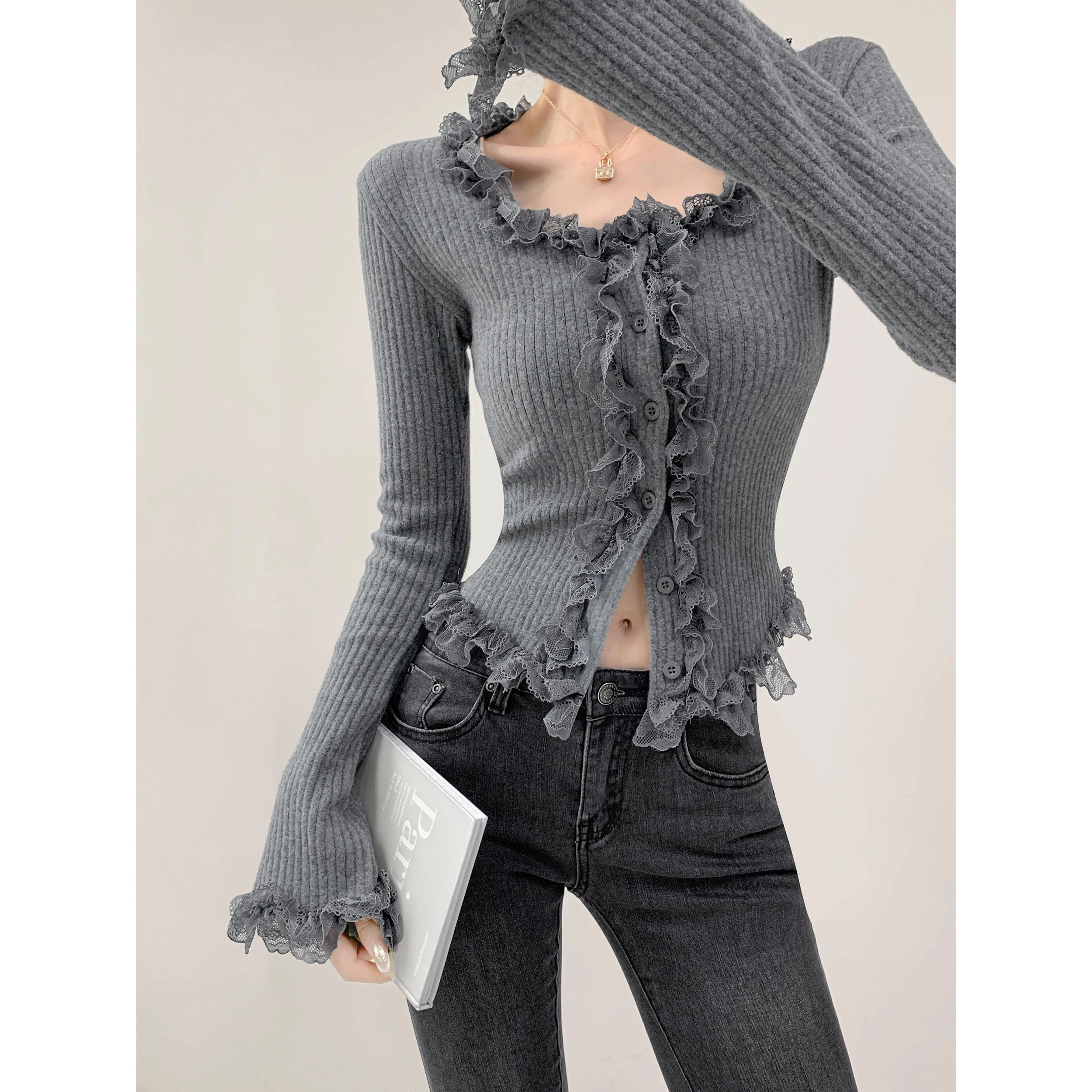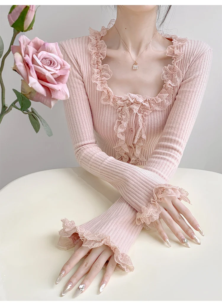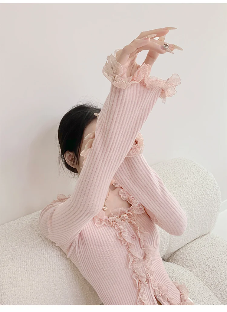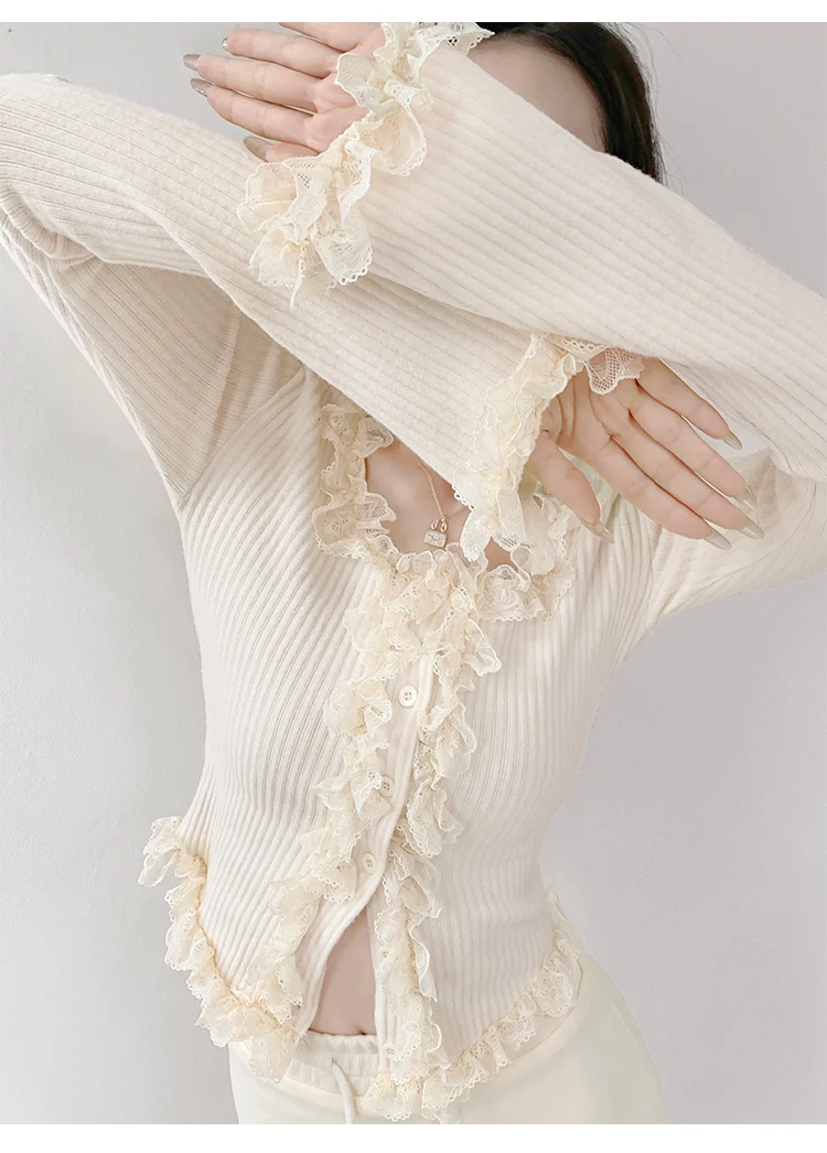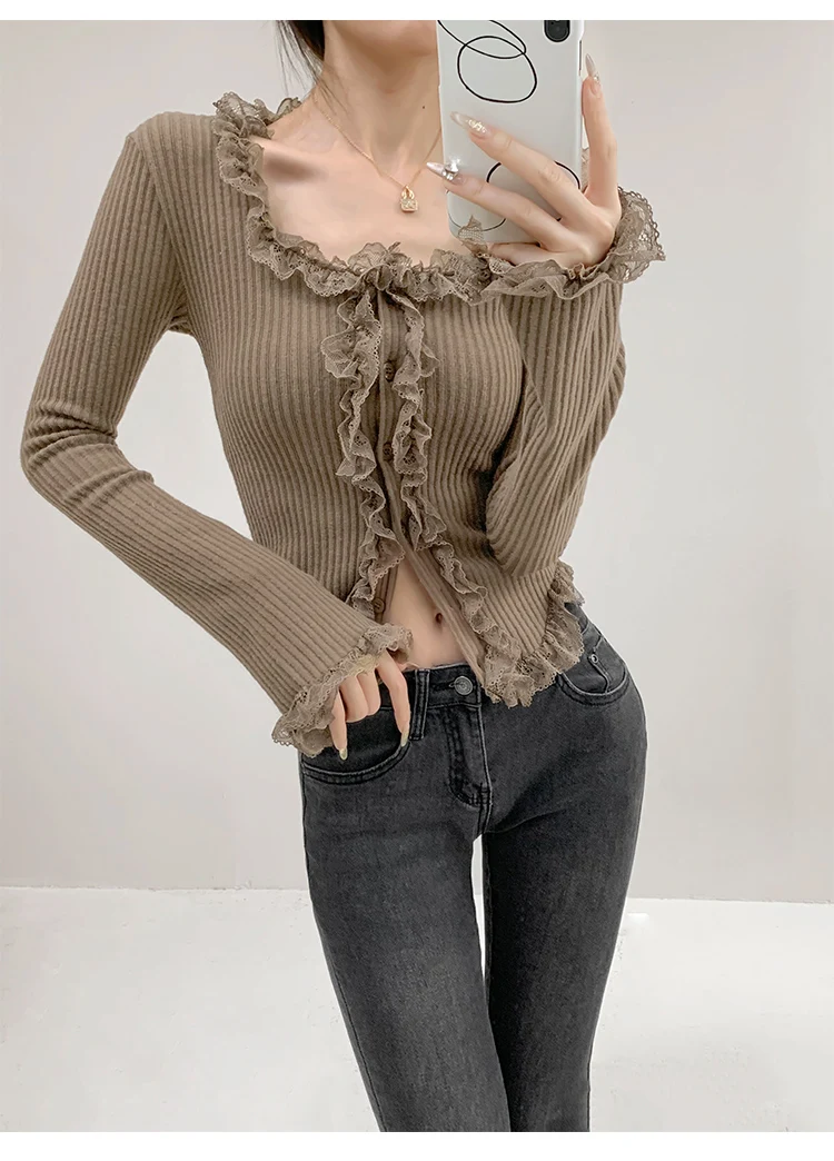 2025 Square Collar Lace Edge Splicing Long Sleeve Knitted Sweater Women's Retro Short Style Slim Tops Single-breasted Cardigan