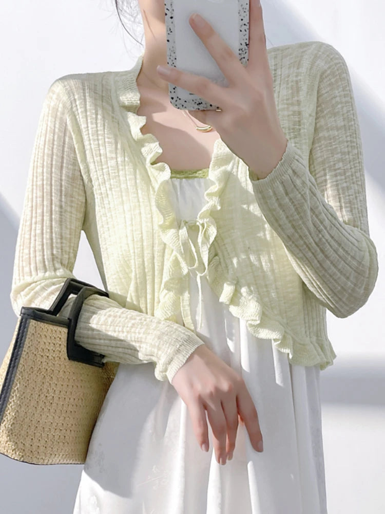 Lace Trim One Button Long Sleeve Crop Top Women Short Sleeve Open Front Ribbed Knit Cardigan Sweater Summer Fairycore Outfit