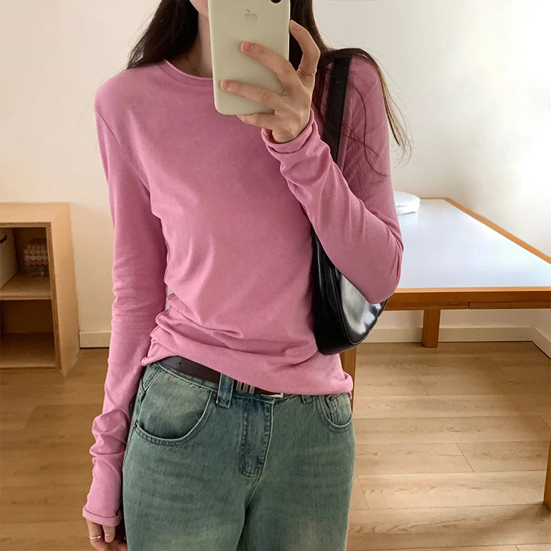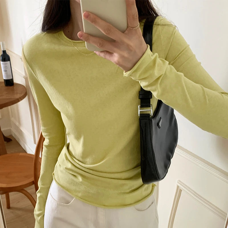 Spring Autumn T shirt Women Tops Solid Long Sleeve Ruched O Neck Tshirts Female Korean Casual Streetwear High Quality Base Tees