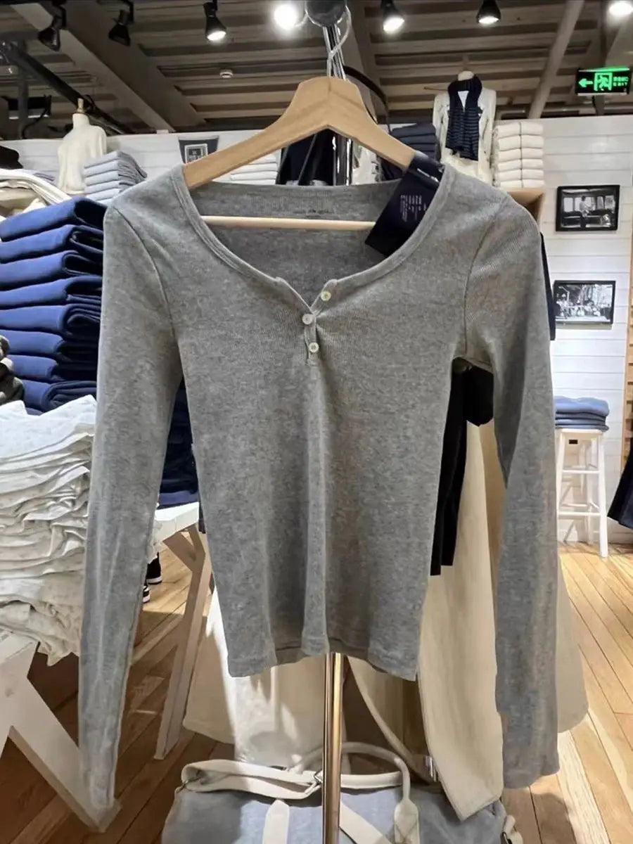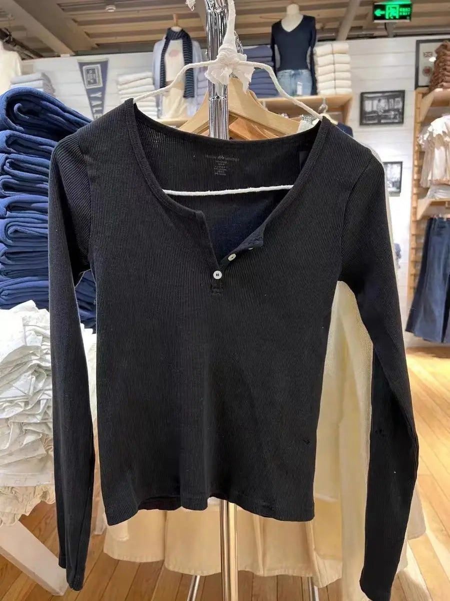 Three Buttons Ribbed Long Sleeve T-shirts Women Autumn Soft Cotton O-Neck Vintage Top Female Sweet Cute Pink Y2k Streetwear Tees