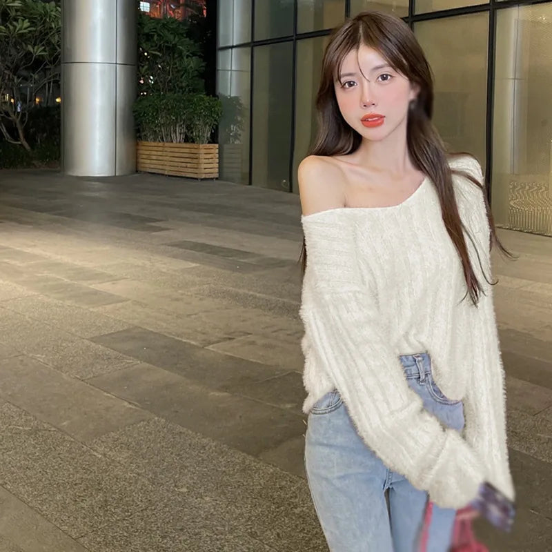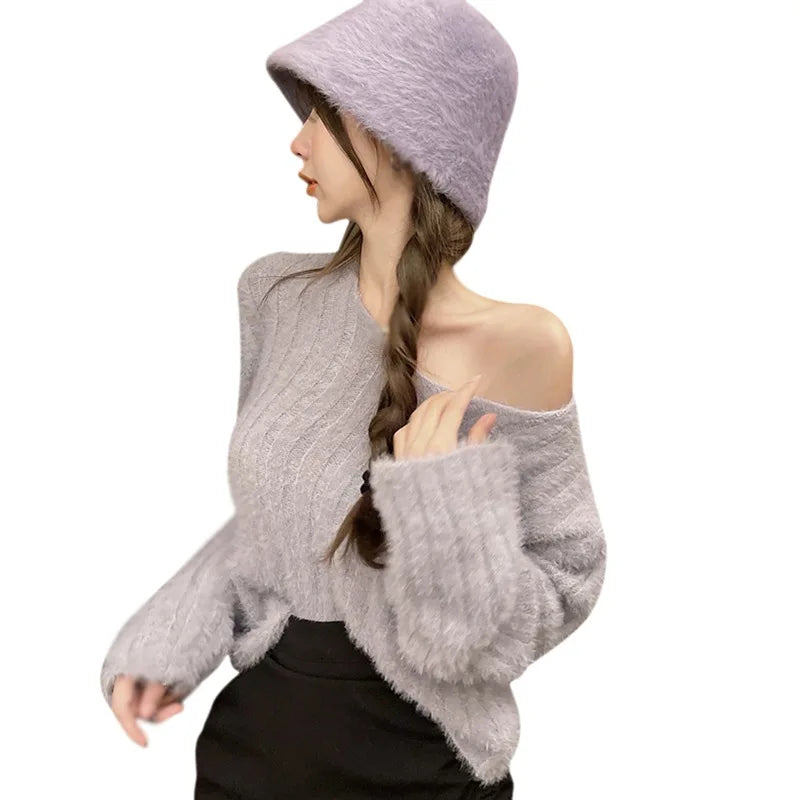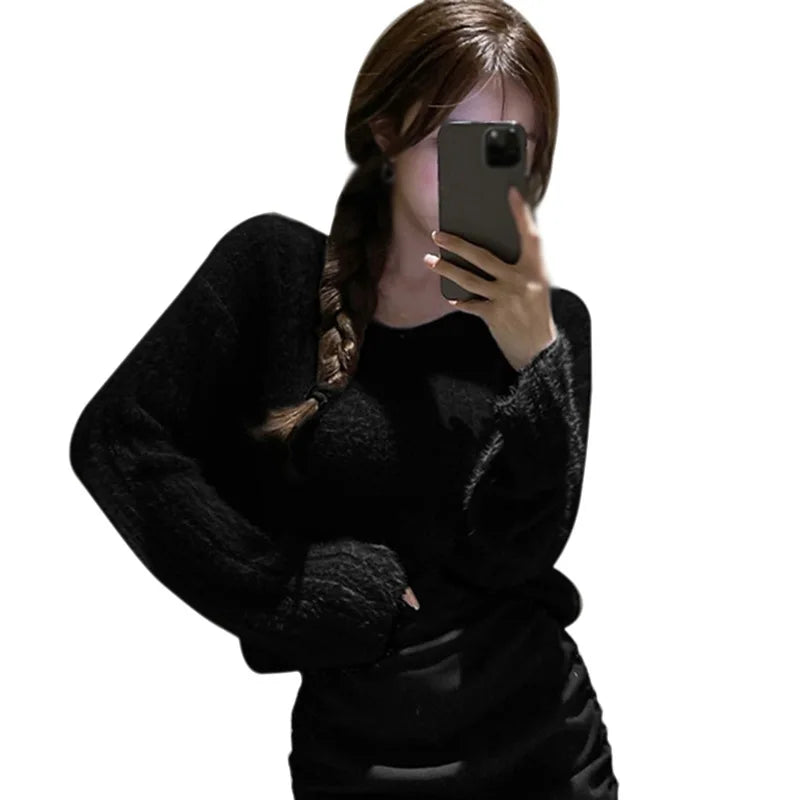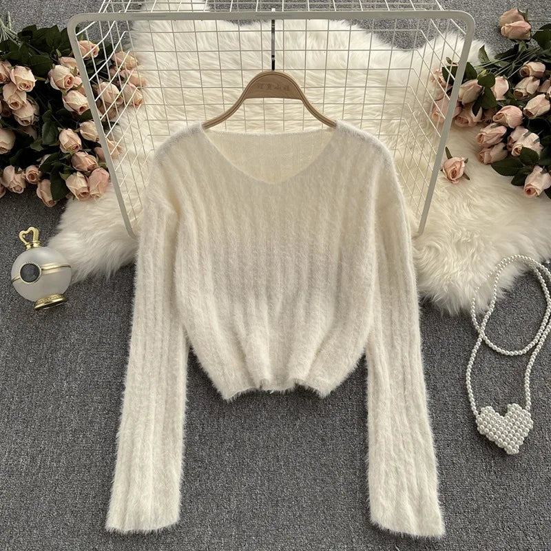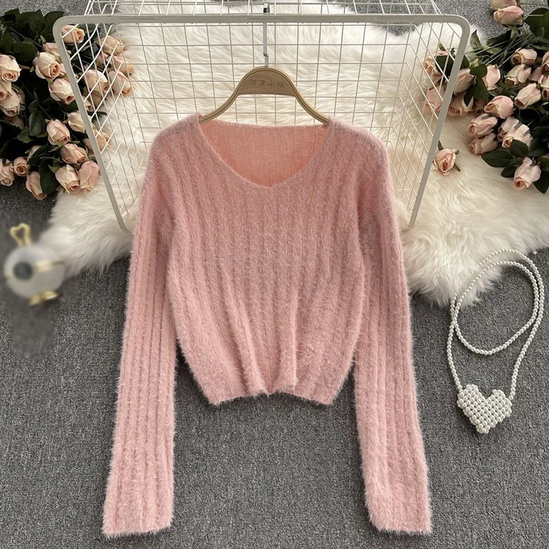 Winter Women Pullovers Loose Fit Knitted Sweater Base Layer Shirt Long Sleeves V Neck Solid Color Warm Tops Lady Casual Jumpers