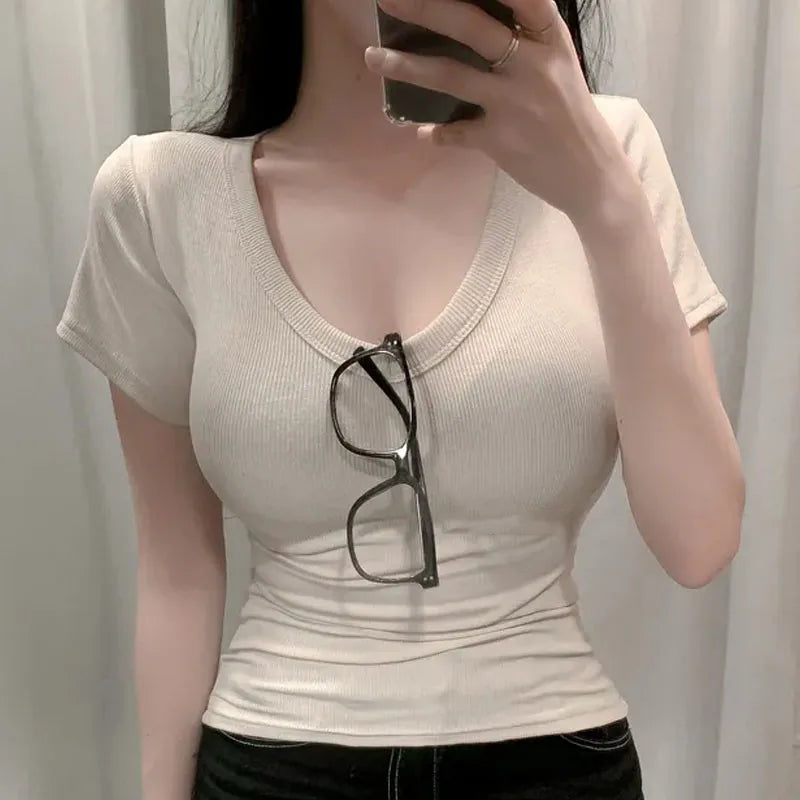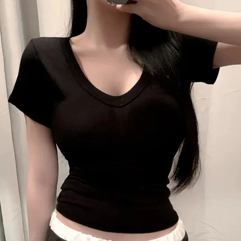 2025 Short Sleeve T-Shirt Women Solid Simple Casual Soft All-Match Basic Crop Tops Tees Summer Fashion Skinny Tops Black White