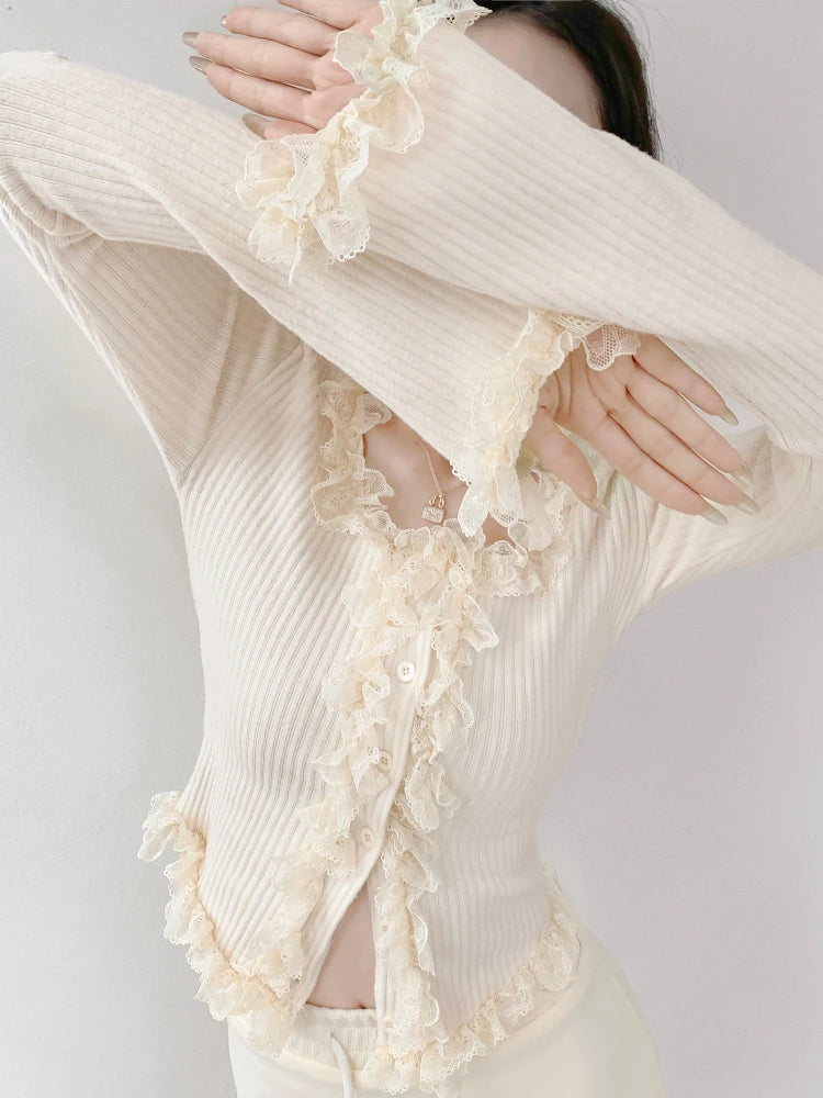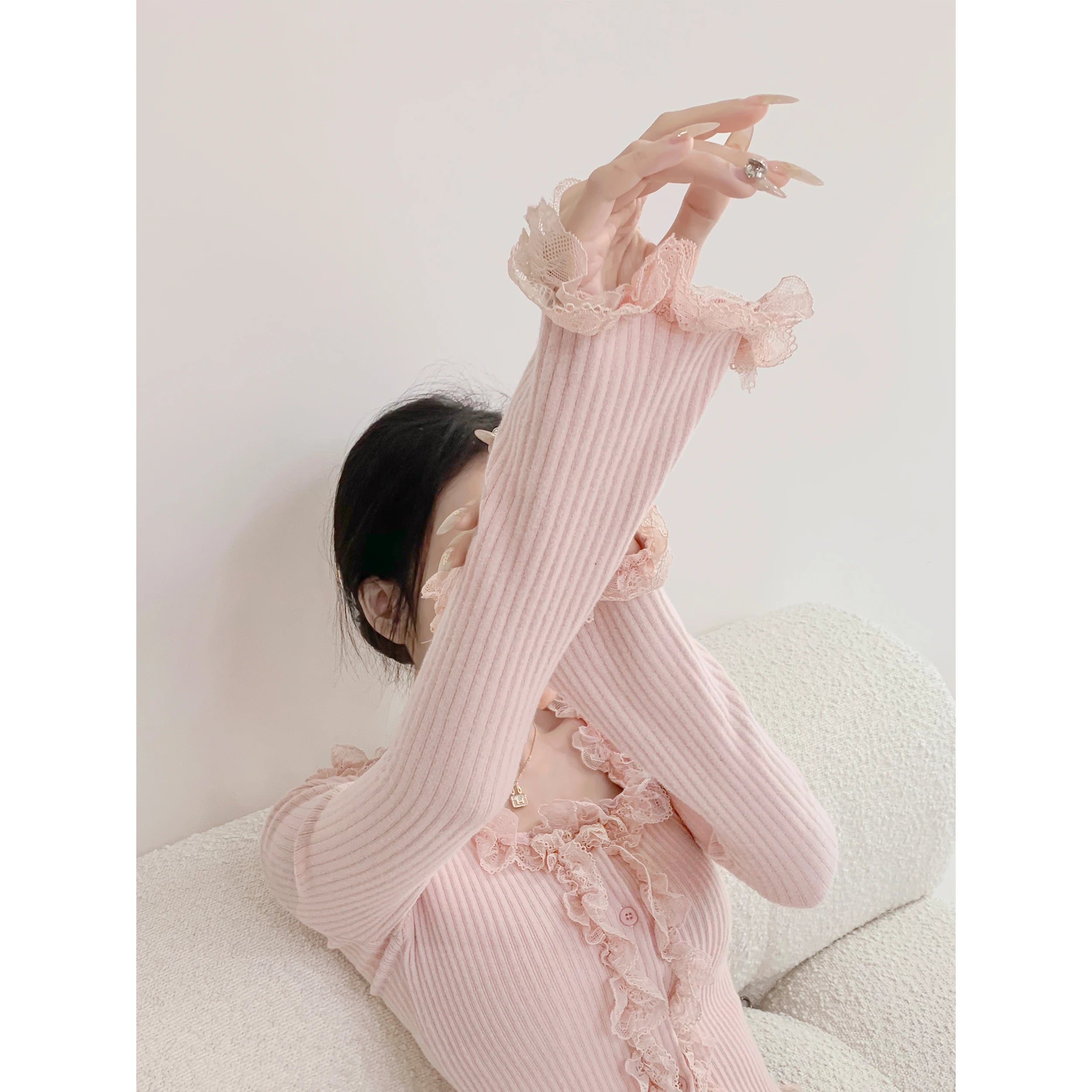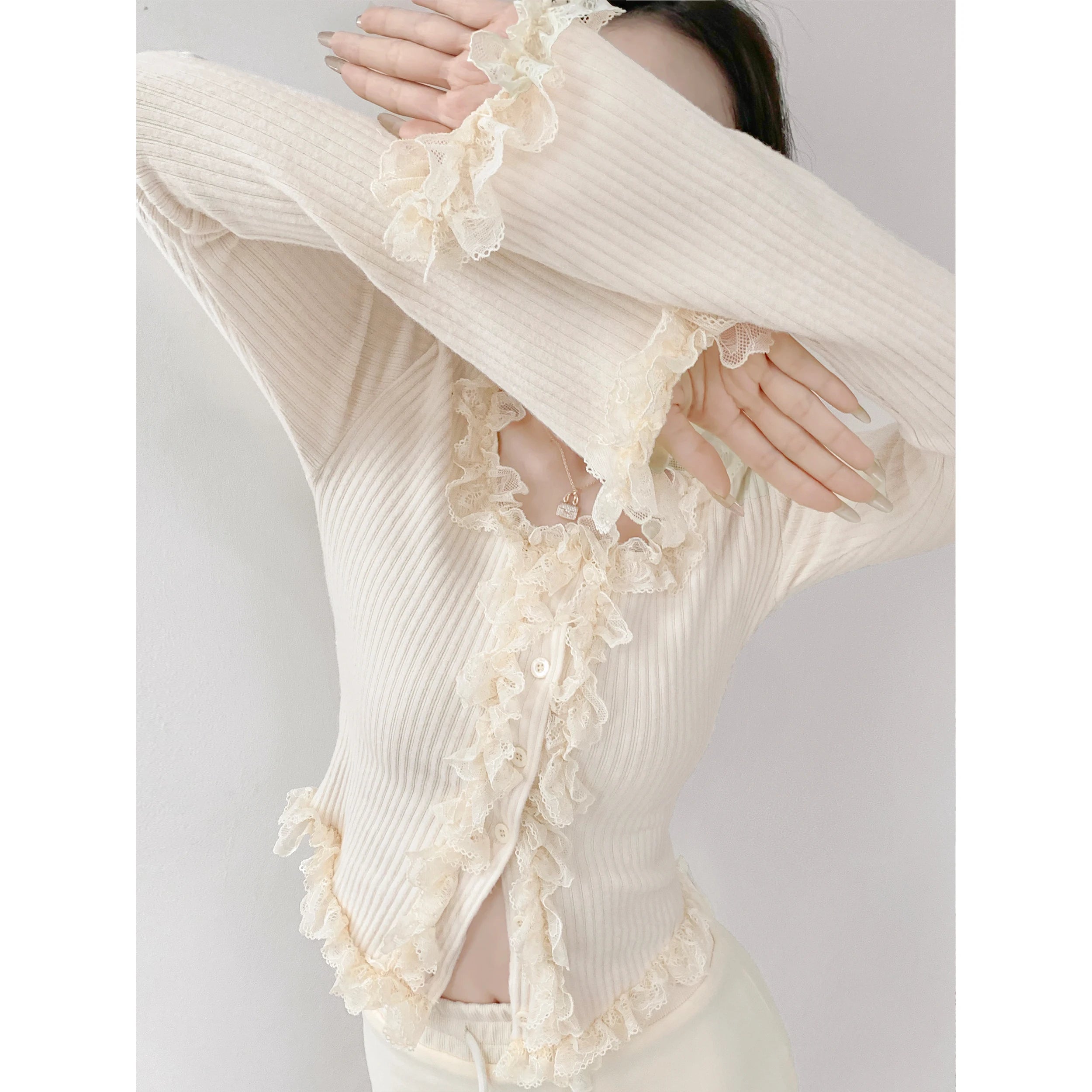2025 Square Collar Lace Edge Splicing Long Sleeve Knitted Sweater Women's Retro Short Style Slim Tops Single-breasted Cardigan