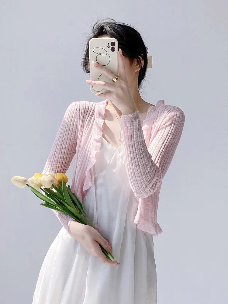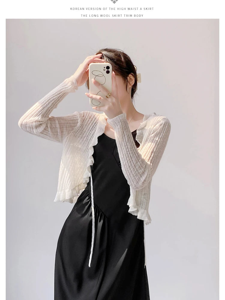 Lace Trim One Button Long Sleeve Crop Top Women Short Sleeve Open Front Ribbed Knit Cardigan Sweater Summer Fairycore Outfit