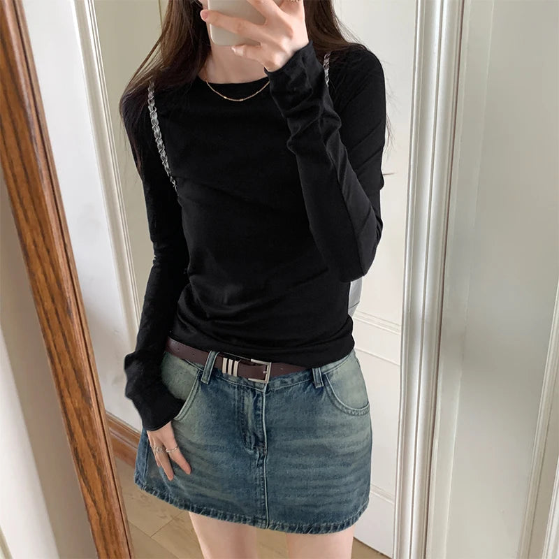 Spring Autumn T shirt Women Tops Solid Long Sleeve Ruched O Neck Tshirts Female Korean Casual Streetwear High Quality Base Tees